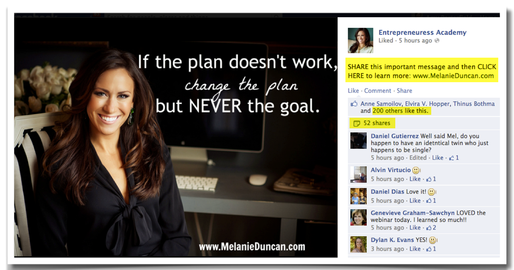 Melanie Duncan’s strategy is especially savvy — not only does she give a clear, direct CTA (“Share this important message and then click here to learn more”), she also offers a URL in the status update. Images + links ignite clicks!